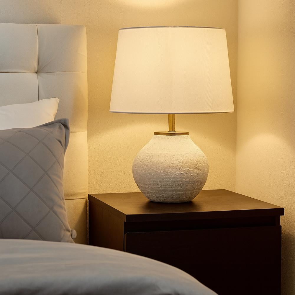 اباجورة طاولة بتصميم بسيط وأنيق، بقاعدة سيراميك بلون أبيض مطفي وملمس خشن يضفي طابع طبيعي وهادئ. تأتي مع قبعة قماشية باللون الأبيض وعمود بلون ذهبي أنيق، مما يجعلها مثالية لغرف النوم، المعيشة أو المساحات الهادئة.