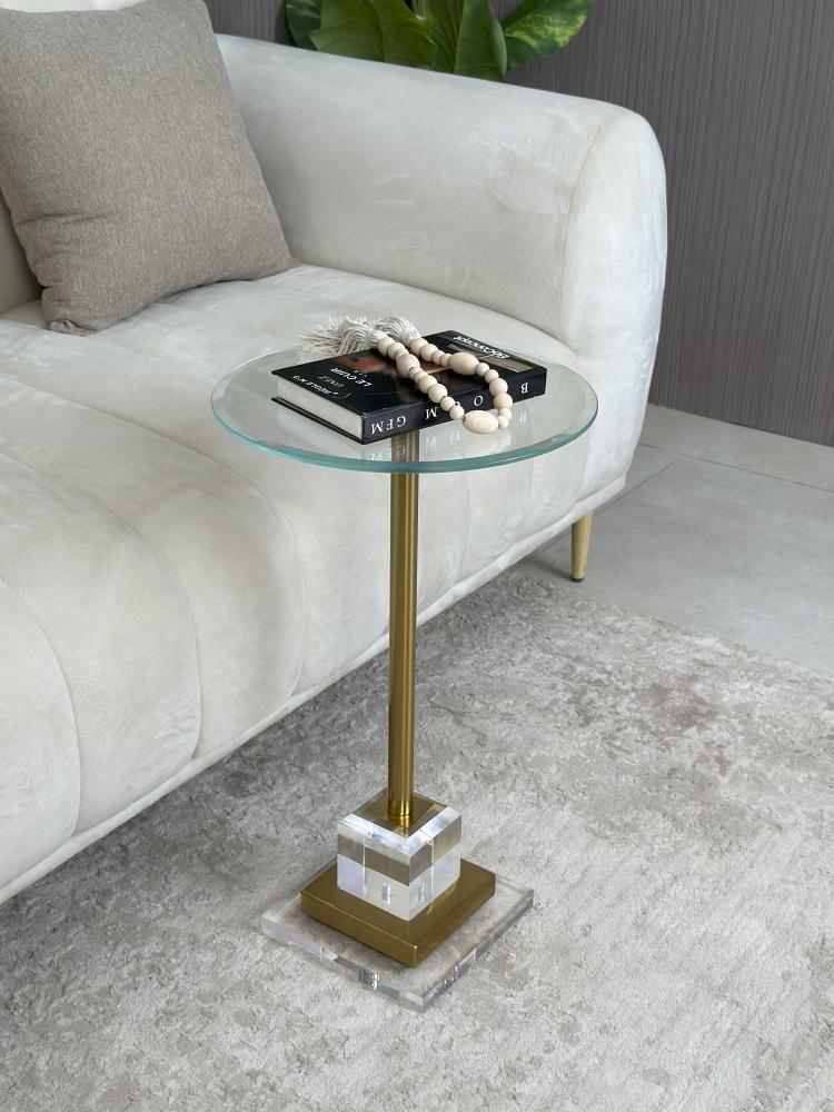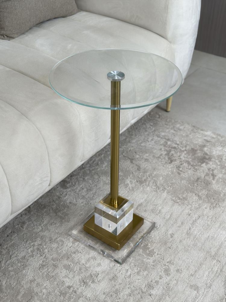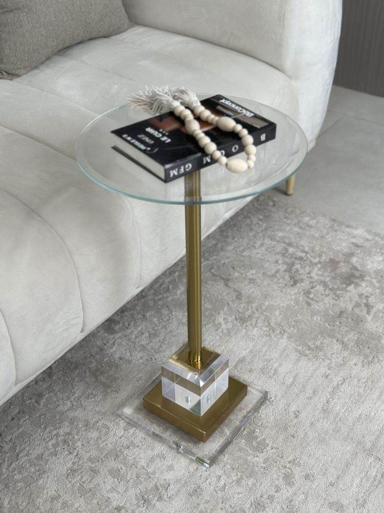 أضف لمسة فاخرة إلى منزلك مع هذه الطاولة الجانبية التي تجمع بين العصرية والأناقة، حيث يمتزج السطح الزجاجي الشفاف مع العمود الستانلس ستيل، ويكتمل التصميم بقاعدة كريستال متينة فخمة مدمجة بالاستانلس ستيل.