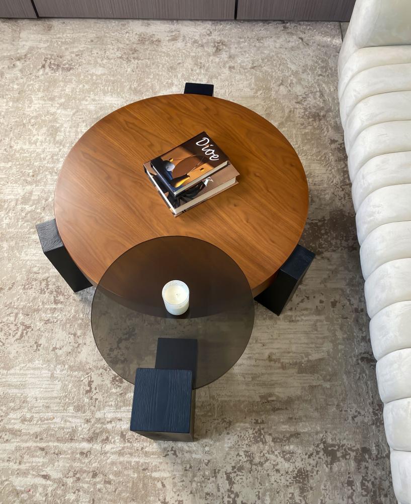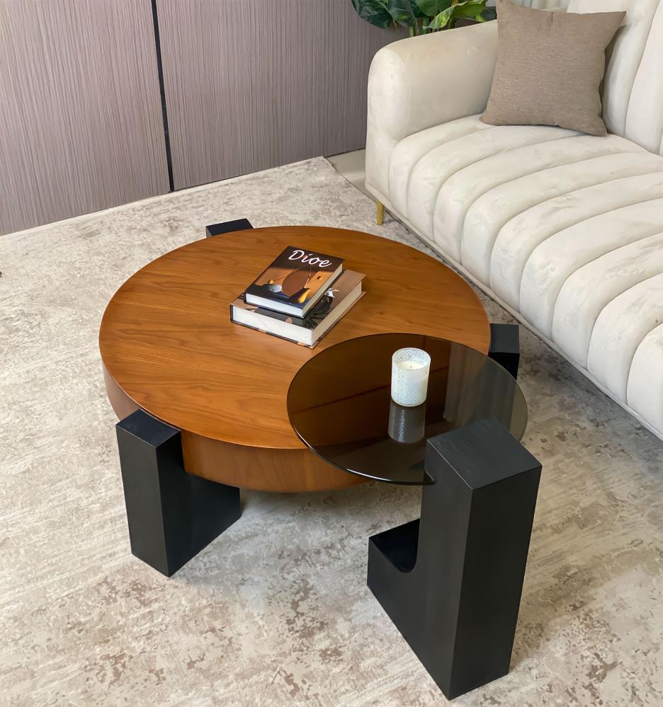 طاولة قهوة دائرية بتصميم عصري أنيق، تجمع بين البساطة والفخامة. سطح الطاولة مكسو بقشرة خشب الجوز الطبيعي، تمنحها لمسة دافئة وطبيعية، بينما تستند على قواعد خشبية متينة باللون الأسود المطفي تمنحها ثباتاً وأناقة.