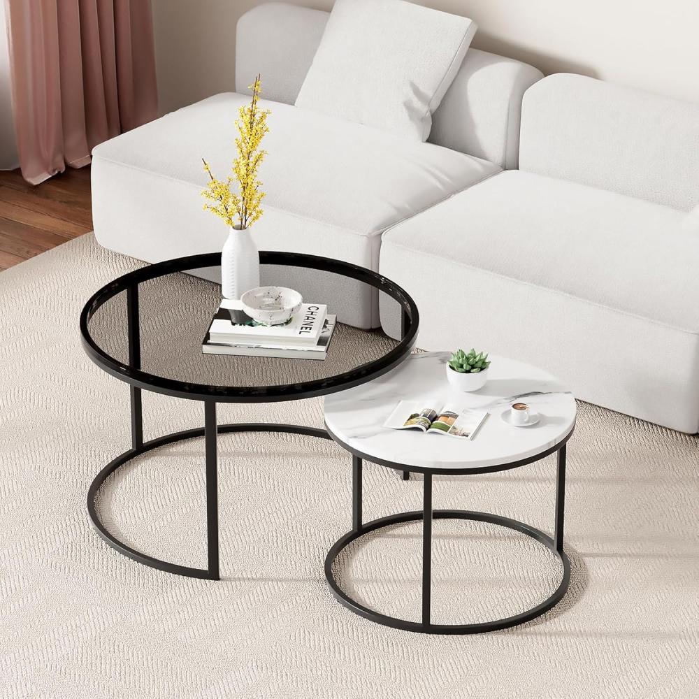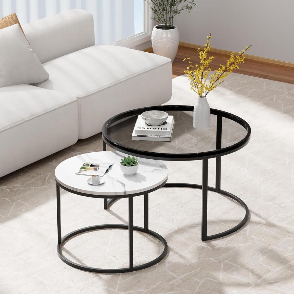 يتميز السطح العلوي لكل طاولة بشكل مختلف عن الآخر، حيث تتميز الطاولة الكبيرة بسطح زجاجي أسود جذاب، بينما تأتي الطاولة الأصغر بسطح رخامي أبيض مع عروق رمادية، مما يخلق توازنًا لونيًا رائعًا.