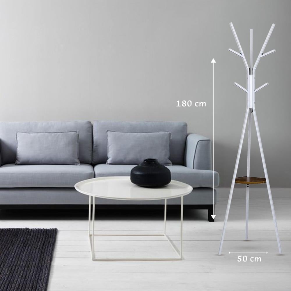 علاقة ملابس ثلاثية الأرجل باللون الأبيض مع رف خشبي متعدد الوظائف