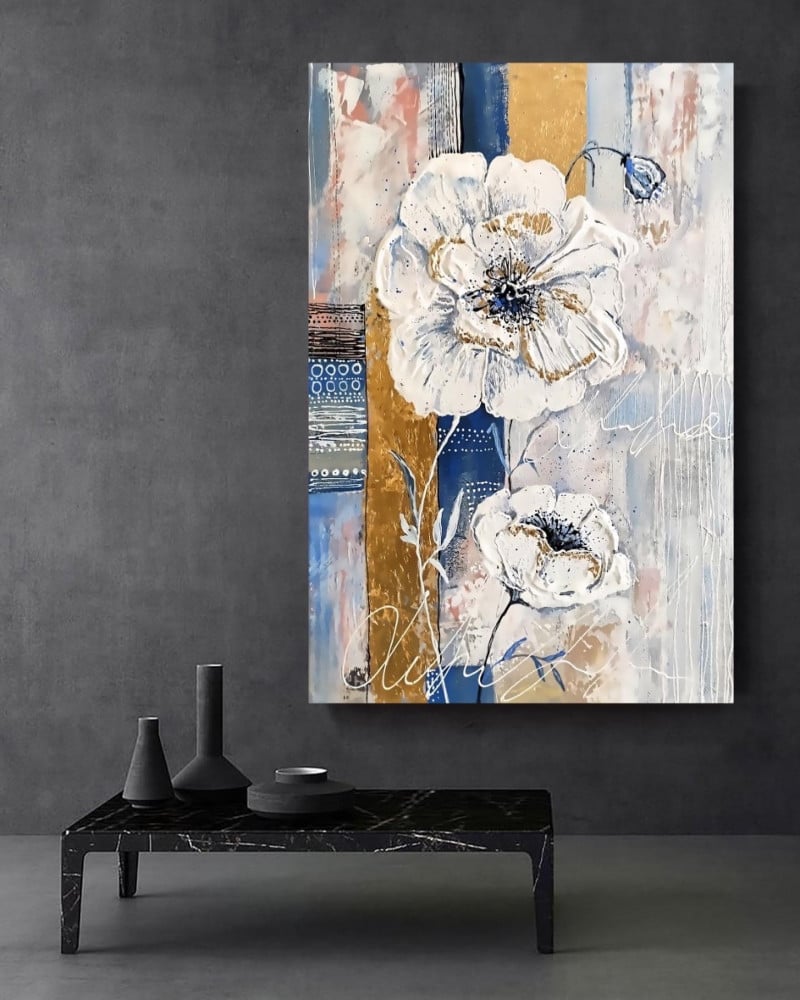 - لوحة من الفن التجريدي الحديث، مزيج من ألوان مشرقة بالأزرق والبيج بطابع تصميم الورود المميزة.