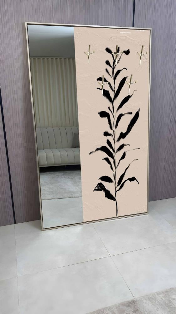 مرآة أنيقة تجمع بين الانعكاس الواضح واللمسة الفنية الجريئة، حيث يأتي النصف الأيمن مزينًا بلوحة عصرية مرسومة بأسلوب حر، تضفي على القطعة طابعًا فنيًا مميزًا. مزودة بعلاقات أنيقة في الأعلى، مما يجعلها مثالية لتنسيق العبايات، الشالات، أو الإكسسوارات اليومية.