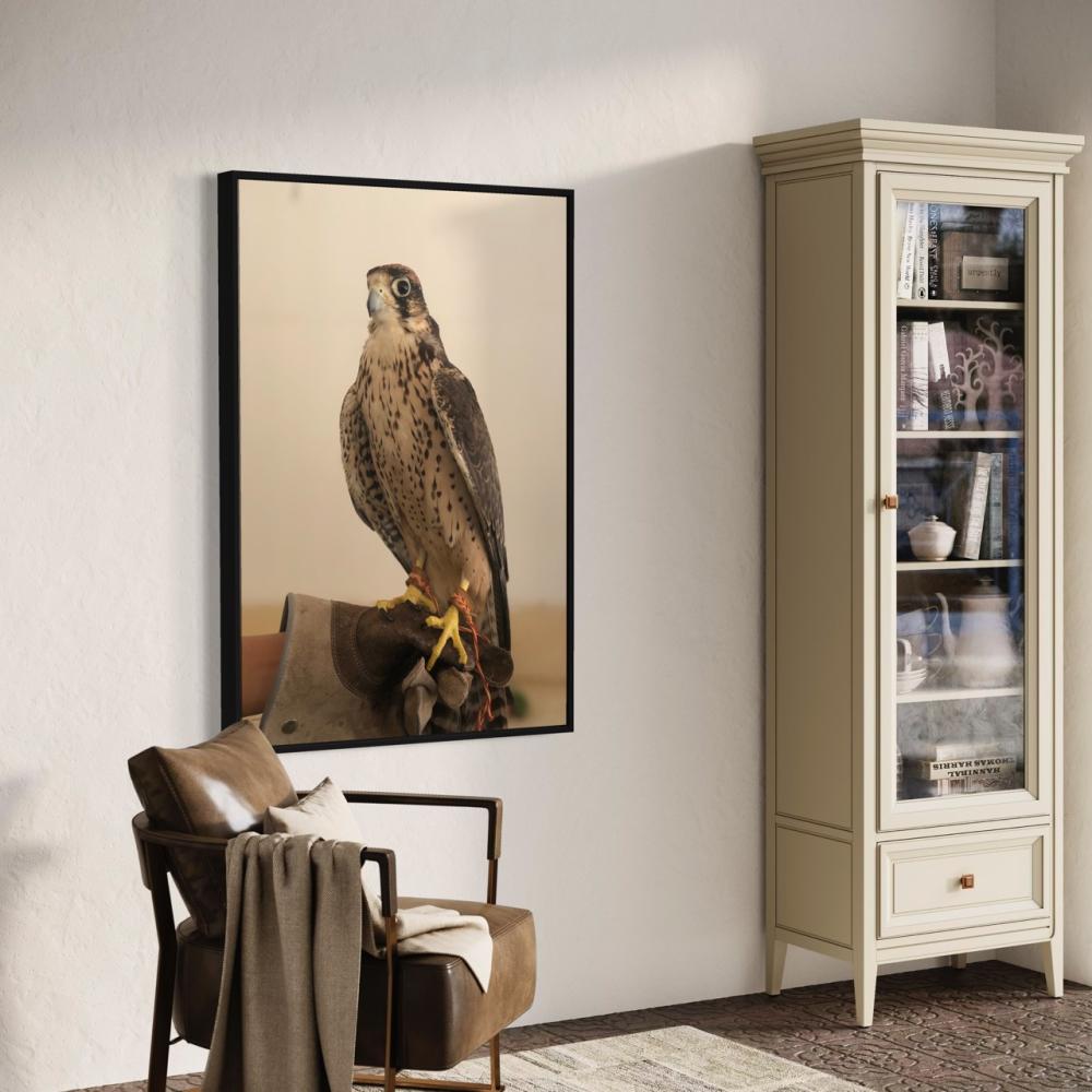 تمثل اللوحة مشهداً طبيعياً آسراً، حيث يقف الصقر بكل شموخ على القفاز الجلدي، مما يعكس قوة وجمال الطيور الجارحة. تضفي اللوحة جواً من الهدوء والطبيعة على المكان، وتعد نقطة محورية في أي تصميم داخلي.