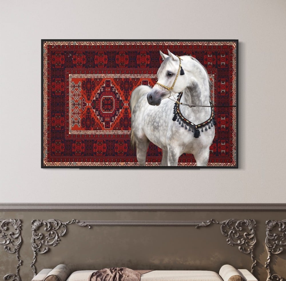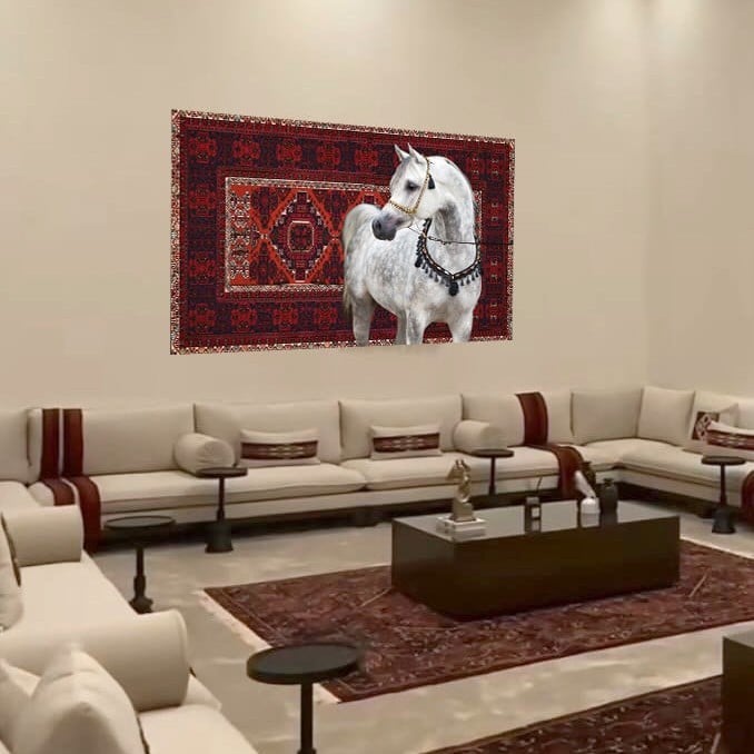 - لمسة عريقة: إنها لوحة فنية مميزة تعرض خيلًا على سجاد أحمر اللون، يخلق مزيجًا من الجمال والأناقة وتُضيف لمسة جذابة وفخمة للغاية.